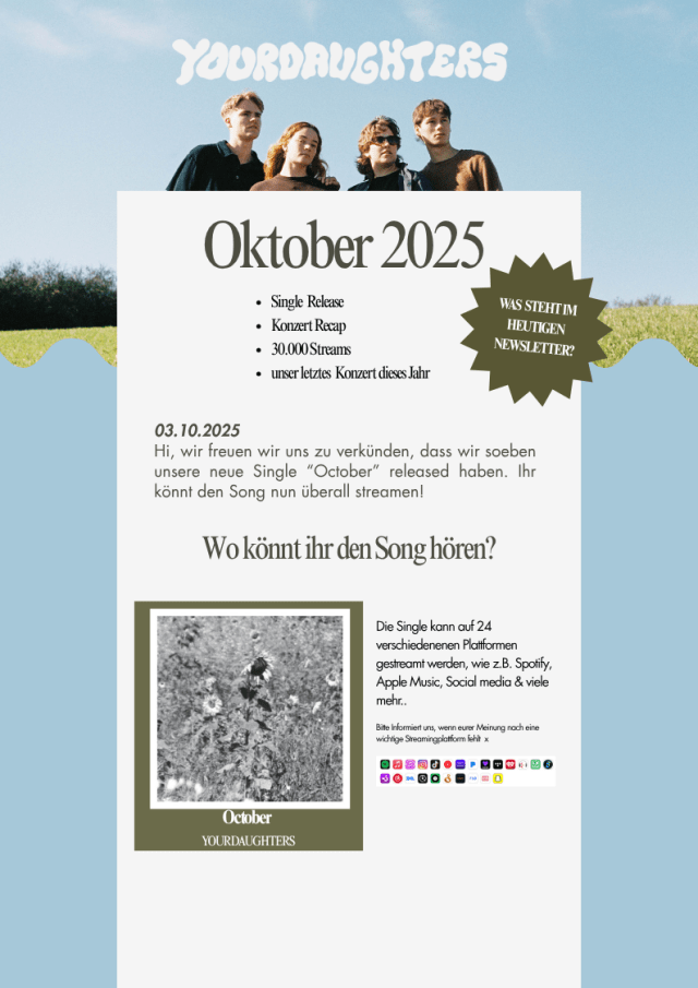 YOURDAUGHTERS-Newsletter 6. Oktober 2025 — Hinterlasse einen Kommentar Teilen mit: Auf X teilen (Wird in neuem Fenster geöffnet) X Auf Facebook teilen (Wird in neuem Fenster geöffnet) Facebook Gefällt mir Wird geladen … Ähnliche Beiträge